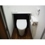 洗面所と同様に、ダークブラウン+ホワイトを基調とした温かみのある空間にしました。 タンク、給水管やコードをキャビネットに隠して、タンクレスのようなスッキリとしたトイレになりました。