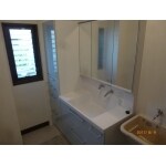 収納が多いのと鏡も3面鏡のため全て収納できます。 ユニットバスと同じ色にしたことにより明るく清潔感のある洗面所になりました。