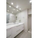 お二人が同時に身支度が出来るように、幅1,200mm確保し、下台はTOTOのエスクアをご提案致しました。カウンターは洗練された薄型フォルムデザインのクリスタルカウンター、宙に浮いて軽やかな印象を与える収納形状が特徴です。既製品の三面鏡ではお二人同時に作業をする際に鏡の継ぎ目が顔の位置にかぶってしまうため、オーダーで作製し、チャイルドミラーも取付致しました。下部に間接照明を仕込むことでやさしく洗面台を照らしています。ダウンライトは集光タイプと首が振れるユニバーサルダウンライトを組み合わせています。