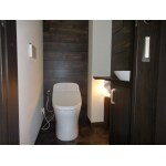 タンク式シャワートイレ一体型便器に替え、壁はアクセントをつけるため木製壁材に施工しました。