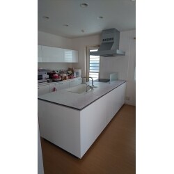 奥様が気に入られたデザインのキッチンを取り付けたい キッチンの反対側に収納が欲しい 前が狭かったので広く使いやすく使えるものがいい