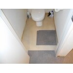 暗色でシックな印象に変身しました。トイレの中までフロアタイルを貼り込んであります。段差にあるノンスリップは、既存の物を取外し再利用しました。