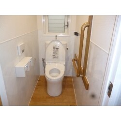 肘掛一体型の紙巻器を設置することで、ウォシュレットのリモコンも操作しやすい場所に取り付けることができました。 対面の手すりは使い慣れた物を高さを調整して再取付けしました。 便器は節水型の便器を採用し、腰壁はお手入れのし易いメラミンパネルで仕上げました。