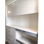 家電を一ヶ所にまとめてスッキリ収納ができ、自動で蒸気を排出する機能付きのキャビネットのご提案です。扉は上品な≪スムースホワイト≫。お客様にも人気のシリーズをご提案させて頂きました。