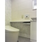 トイレはTOTO ネオレストAH1 レストルームドレッサーセレクトシリーズにお取替え。 超節水で便器洗浄水量は13Lから3.8Lへ、75%の節水を実現しています。 また既存はタンク付きのトイレと埋め込みの手洗いという仕様でしたが、今回はカウンター付き手洗器を設置しました。スタイリッシュな角型のデザインです。 壁にはLIXILのエコカラットを施工しました。