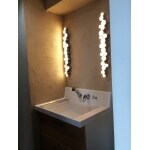 照明はお客様がご購入したものを取り付けました。 後程鏡も購入されるそうです。 なるべくお掃除の楽な水栓が壁についているタイプの洗面台をご提案しました。
