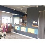 対面式にして、吊り戸棚を付けないオープンキッチンをお勧めしました。また、コンロの前は壁があった方が油のハネなどお掃除しやすいので壁付けI型キッチンにし腰壁を造作しました。 より開放感を出すために、腰壁をキッチンの高さと同じ高さに造作しました。壁にはニッチを取り付け、雑誌など飾れるように、クロスは黒板になるものを貼って、お子様の遊び場も兼用しました。