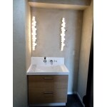 引き出し収納にして収納力を増やしました。 照明や鏡はゆっくりお客様が選びたいとの事でしたので、下台を弊社で施工し照明・鏡はお客様でご用意されました。