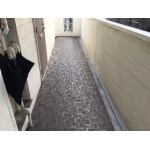 共用化の型押しセメント板のシールが劣化していて雨漏りしていました。廊下は専用のシート張りをご提案し、階段も滑りやすかったのでシート貼をしました。 鉄部の錆もひどかったので、塗装をご提案しました。