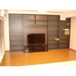 元々は和室を含んだ3LDKでしたが、その和室をなくし、大きなLDK 1部屋(約15帖)にし、その一角でお仕事もなさるご要望をお持ちでした。 写真のように、スッキリとした収納を壁全体に作りつけすることにより、大量の所蔵品を収納できるようになりました。 また、閉鎖的であったキッチンも、吊戸棚が据え付けてあった壁面を一部取り除くことにより、開放感のあるキッチンとなりました。