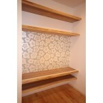 以前の戸襖を大変気に入っていらしたので、 テレビボードの後ろに貼って、再利用することをご提案させて頂きました。 棚板は、担当者が奈良の製材所まで、木材を見に行きました。