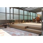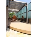 花壇以外の部分は土が露出することなく雑草が生えにくく施工。 ワンちゃんの遊ぶスペースとして照り返しの少ないレンガ調の物をデッキ部以外の箇所へ敷設。 昼夜を問わず人を呼んでパーティーを行ったり、外での食事を楽しめるようにデッキ+テラス屋根での空間を作成。 隣地に賃貸物件が建ち、以前は植栽で目隠しをされていたが手入れが大変と伺い、目隠しのパネルを提案し設置。