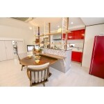 構造上の問題で配管スペースの確保ができず、アイランドキッチンへの変更は難しいという状態。そこでI型の形状は変えず、カップボードを背面に配置してカップボード周りを造作することに。完全な対面キッチンとは言えませんが、開放的にして視線が通ることで、カップボード上で手元は作業をしながら家族と会話ができてリビングを見渡せるようになりました。 あまり開放的にして手元がすべて見えてしまうのも気になるので、カップボード周りの笠木に柱を立ててフレームを取り付け、飾り棚を造作。ここにお孫さんとご家族の写真を飾ることになりました。 キッチンの色は奥様の好きな赤色を選択。空間のアクセントになり、また紫もお好きということでダイニング側のカウンター上にシエルグラスのタイルを張りました。 カップボード周りのグレーのクロスは、実は黒板クロスです。お孫さんがお絵かきできるように、かつタイルとの調和を考えてグレーの色にしました。楕円型のダイニングテーブルをカウンターの下に差し込むことで、カップボードと一体的に使用できるよう高さを工夫しました。