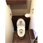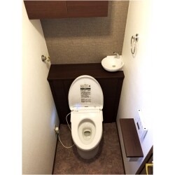 お客様の方でショールームで検討した結果、座り心地の良い商品を選定しご依頼頂きました。トイレ背面に設置した棚、天井の収納、手洗い器もセットの商品で、棚の中にタンクが設置されています。機能的ですっきりとした空間に生まれ変わり、お客様より「別世界だね!」との嬉しいお言葉を頂けました。