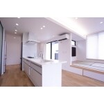 システムキッチンにカラーバリエーションが豊富なパナソニックのラクエラを採用、広くて明るいリビングダイニングに映える彩りを考慮して、カウンターや扉をホワイトで統一することをご提案いたしました。また大容量の収納を可能とするため、壁一面に食器棚を造作することをご提案いたしました。