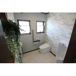 以前のトイレは大と小で別れてご使用でした。 今回トイレリフォームで大小一つにまとめることになりました。 大と小の間の壁を取り一つの空間にまとめ。 奥行きを出すため入口を手前に引いた事でとても 広い空間が出来ました! 大便器はTOTOのネオレストAHタイプです、見た目も高級感が有り このトイレにマッチしていますね~ 小便器はプッシュ式の小便器ですフラッシュバルブを器具に 内蔵してあるので一体感のある美しいフォルムです。 床はお手入れのしやすいCFシート壁と天井はクロスで仕上がりました。 清潔感のある爽やかな森の中に木漏れ日が入ってくるような とても素敵な空間に仕上がりました!