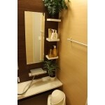 紙巻器やタオルリングは木製タイプを選ばれ、温かみのある空間になりました。床は耐久性のあるストロングクッションフロアのダーク色、メンテナンスも配慮した商品を選んで頂きました。