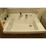 サイド収納付タイプの洗面化粧台をお選び頂きました。壁付け水栓&ハイバックガードの大型洗面器なので、大きくて使いやすく、すっきり片付くドレッサーです。毎日、使いやすさが実感できます。