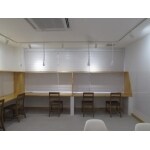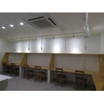 (旧株式会社ウイングでの事例です。)造作カウンターを大きめで作成しました。 作業場でしたので、明るい空間を心掛けました。 コンセントが壁から取れなかったので、天井からとれるように工夫しました。