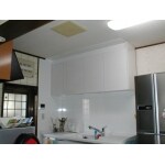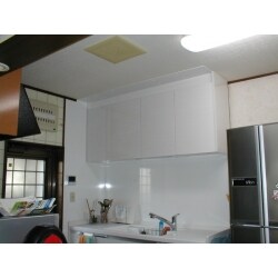 システムキッチン背面のシンク付き作業台を取り替え。タイルの壁面からキッチンボードに取り替えることにより、周りが明るくなり手入れも楽になります。