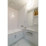 シンプルでも、キレイ装備が満載なユニットバスは、ピンクを挿し色に明るくて可愛い浴室に。