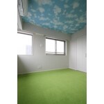 天井には青空の壁紙を張り、床には防音性とふかふかとしたやさしい肌さわりのグリーンのタイルカーペットを敷きました。L型の窓と相まって爽やかな空間に仕上がりました。