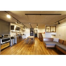 元々の和室2部屋とキッチンの間仕切りを無くし、広々としたLDK空間に。 天井はコンクリートをむき出しにし、高さを最大限にとりました。 照明はダクトレールを活用したスポットライトをご提案。床はヴィンテージオイル塗装の無垢材、壁は塗装で仕上げ、インダストリアルな雰囲気に。