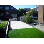 塀の一番高い所160㎝から低くしていき、小窓をつけることで歩道や隣地との境目をはっきり区切らない程よくオープンな庭になりました。 一番奥は人口芝を敷きました。お手入れの手間もなく、一年中緑色を保つことができます。