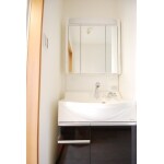 (旧京都建物株式会社(京都建物工務店リフォーム)での事例です。)暗い印象だった洗面も、黒い扉がカッコいい洗面台に入れ替えをさせていただきました。