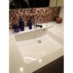 洗面には天然石の輝きが美しいジャンスカイというベネチアンモダイクタイルを装飾しました。
