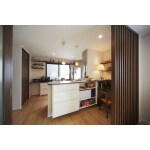 2階のフロア全てをLDKにして、ゆったりとくつろげる広々とした空間をご提案しました。 LDKの一角には、ご主人様のパソコンスペースを設けています。 秘密基地のような空間をご希望されていたため、スリット格子で仕切りおしゃれな個室空間を演出しています。 スリット格子なので圧迫感も無く、開放的な印象を残すことが出来ました。 キッチンの横に位置しているので、調理中の奥様と会話を楽しんでいただけます。 また、天井の照明を全てダウンライトに統一することで、明るく広がりのある空間になりました。 パソコンデスクの前に取り付けた飾り棚や明かり窓には趣味の物を飾っていただき、ご夫婦の素敵な個性あふれる、モダンなリビングに仕上がりました。