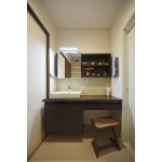 洗面室でお化粧ができるように、カウンタータイプの洗面台を設置しました。 鏡はスライドさせてお好きな位置に移動させることができます。