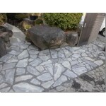 アプローチ周辺部の乱形石張り工事です。石のサンプルを打ち合わせに持参させて頂き、施主様は石英石のユニソンのワズストーン(イズモ)を選ばれました。天然石ならではの奥行きのある表情としっとりとした深みのある色調が高級感のある落ち着いた空間を創造します。