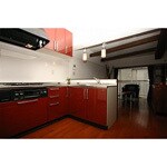 赤いキッチンをメインにプランを作りました。 間接照明で、赤が映える空間に演出しました。 L字型のキッチンに変更することで使いやすくなりました。