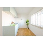 水廻りは、お客様の好きな色の緑をベースに機器のご提案をさせて頂きました。 構造的な壁がある為、壊せない部分もありましたがキッチンの位置を動かすことによりリビングと繋がりが持てる空間になりました。 廊下にはオープンの棚を設けて収納力をUPし、見せたくない箇所はロールスクリーンで隠せるようにしています。 全体的にオークの床とかわいらしいキッチンがポイントのお部屋に仕上がりました。