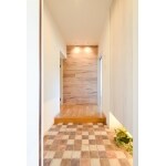 以前は置き型の靴箱がありましたが、右側の部屋を凹ませて下足箱を埋め込みで設置しました。家に帰った瞬間に明るくなるように床や、壁、照明も工夫しています。 玄関を開けた正面の壁に、アクセントの壁を設けました、お客様と一緒に選びましたメープルの板でお出迎えしてくれます。