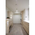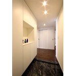 元はタンク式トイレが設置されており、手洗いカウンターは奥の壁まで伸びていました。 カウンターは幅1.0mのものに変更し、残りのスペースを隣接する洋室のクローゼットとしました。 ベッセル式洗面器用カウンターには扉を造作して収納スペースとしています。