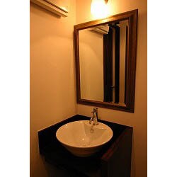 ・洗面器下の空間 両開きのドアを付けないことで圧迫感をなくす。 ・鏡 柔らかい空間のために木の枠を付ける 小さいスペースにゆとりある空間を作りました。