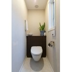 明るいトイレ空間にキャビネットのダークブランをアクセントに。