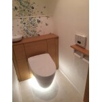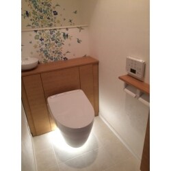 新しいトイレは掃除のし易さも勘案し、TOTO社のレストパルFという壁掛け型の宙に浮くタイプをご提案し、ご採用いただけました。 また、クロスや壁紙は御施主様にサンプル見本を元にお選びいただきました。