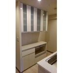 キッチン後ろのコーナーに、ご希望の幅ぴったりのカップボードの設置をご提案させていただきました。 引出し部分と扉部分の両方があり、食器の出し入れがしやすく、容量もたくさんあります。