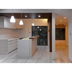 キッチン上部の梁については、解体した母屋にあった梁が意匠的に良さそうであったことから、移設して利用することをおすすめしました。 構造面の検討によりキッチン前の造作収納部分へデザイン的に柱を組み込むプランとし、造作収納についてはイメージ図等でカラー、大きさ、形状をご相談しながら計画を進めました。 キッチン前のカウンターは銘木店で見つけた無垢ミミ付ウォールナット材になっています。