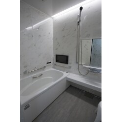 【お風呂】 浴槽の縁は、高さが10cm下がり、手すりが追加で設置されたことで、ご高齢者でも楽に出入りできるようになりました。 床の磁気パネルは、濡れていても滑りにくい凹凸加工で転倒防止に。熱伝導率に優れているため、お湯をかけるだけでポカポカです。さらに、浴室をまるごと保温材で包みこんでおり、 寒い冬でも温かさが続きます。 安全面の強化と共に、高級感のある快適空間づくりを検討。 タカラのぴったりサイズシステムバスで、浴室のスペースを最大限に広く確保。 さらに上品質な鋳物ホーロー浴槽を取り入れ、全面を大理石調の壁面パネルで統一して、施主様の理想「ホテルのような高級感」を追求しました。 浴槽もパネルも床も、汚れが付きにくく落ちやすいため、お手入れが簡単。傷も付きにくいため、いつも綺麗に保てます。 【トイレ】 トイレの脇に、手すりを取り付けました。 収納キャビネット一体型ティモニ Cシリーズ をご採用。背面に収納ができたため、洗面台の下は棚板だけのオープンな空間に。そのため、トイレの中の空間が広がり、閉塞感がなくなりました。