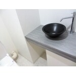 入り口を廊下側に間取りを変更し、扉は折り戸を設置。手洗い器も別置きにしました。