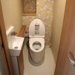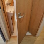 当初はリビング側に拡幅して広いトイレにするプランをご提示しましたが、リビングの壁が不揃いになってデッドスペースが生まれるのと、廊下~リビングのドアを引き戸化できなくなるデメリットが出てくるため、間取りは既存のままでリフォームとなりました。入口に特殊な折戸ドアを使い、ドアノブの移動範囲を少なくして、使いやすいトイレになるようにご提案しました。