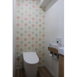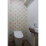 和式から洋式へ、段差を取り払い、フラットなトイレとしました。手洗カウンターも設け、ちょっとした小物も置くことが出来ます。手洗器の下は収納になっています。 クロスはビニールクロスを使用。アクセントになる正面のクロスはポップなデザインのクロスを選んでいただきました。お客様のセンスが活かされた明るいトイレになりました。
