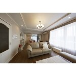 リビングの天井は折り上げを造作。 見切り縁に、クラシカルなクロスとマッチするモールディングをあしらいました。 お引越し後に設置する家具の色味も考慮して、フローリングにはダークブラウンをご選定しました。