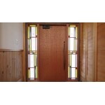 外装も内装もその多くが板張りで、木質感あふれるお住まいでした。しかしながら玄関戸はベーシックなデザインのアルミ製建具でした。そこで、お住まいをイメージしながら、木の重厚感に色とりどりのアートガラスの華やかさをプラスしてご提案させていただきました。