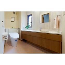 (旧ミサワリフォーム関西中部株式会社での事例です。)奥行きの深い空間を活用し収納一体型の器具をご提案。 また手洗い廻りの仕上げや照明機器の変更により空間全体の統一感を図りました。