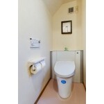 ウォシュレット機能はリモコン式に、タンクは収納と一体化させることでデザインに統一感を持たせました。